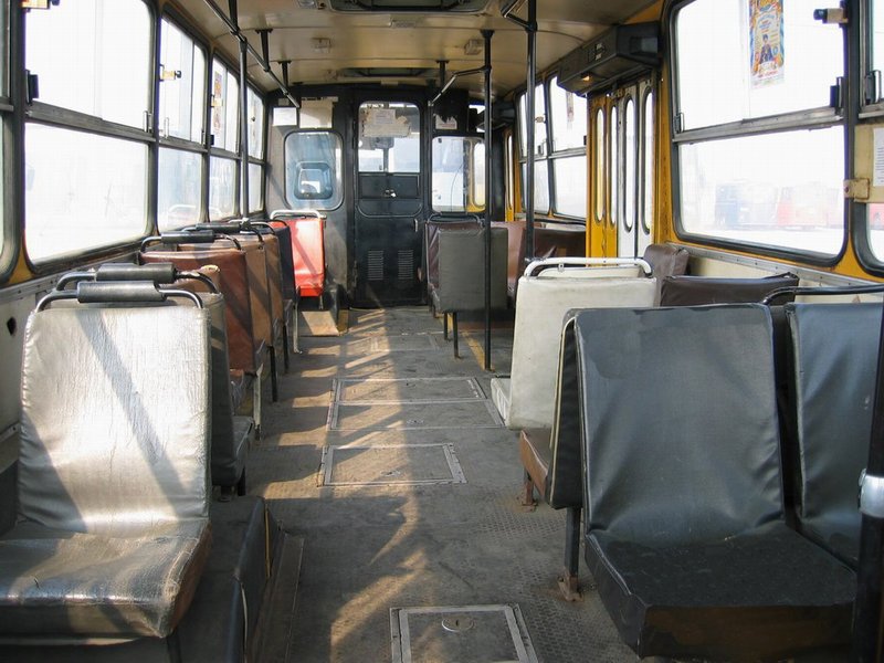 Салон "Икарус-260" 1989 года выпуска в АП №6. Вид на среднюю и переднюю площадки. Кабина водителя уже отгорожена на заводе.