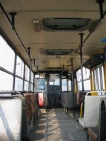 Салон "Икарус-260" 1989 года выпуска в АП №6. Общий вид салона с задней площадки. Обшивка салона ещё в хорошем состоянии, почти как и в 1989 году. Добротно сделанные стёкла и люки в крыше не идут ни в какое сравнение с украинскими.